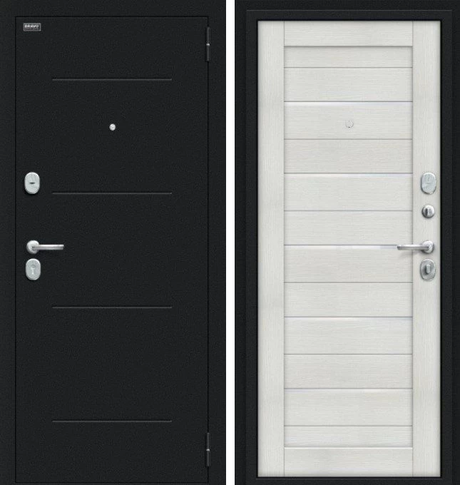 Надежная входная Браво Техно Kale Букле черное/Bianco Veralinga премиум класса по цене 33 949 руб. Большая толщина стали защитит от проникновения в ваш дом, квартиру или коттедж. Используется очень качественная фурнитура: замки, цилиндры, ручки, защелки. Покрытие и отделка двери изготовлено под внимательным контролем производителя. Дверь имеет долгий срок службы и гарантию.